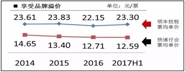 半年报显示, 2014 年至 2017 年上半年的票均收入看,顺丰票均收入分别为 23.61元、23.83 元、22.15 和 23.30 元,远高于行业平均 12-15 元的水平。