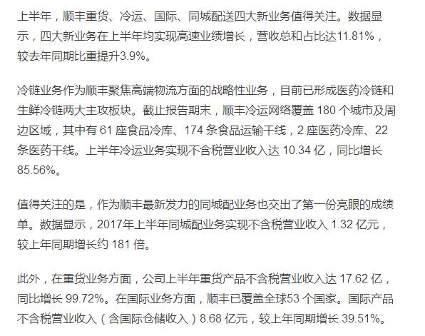 8月25日晚间,顺丰控股(002352)发布2017年半年报,公司实现营收321.61亿元,同比增长23.38%,归属上市公司利润18.84亿元,同比增长7.47%。